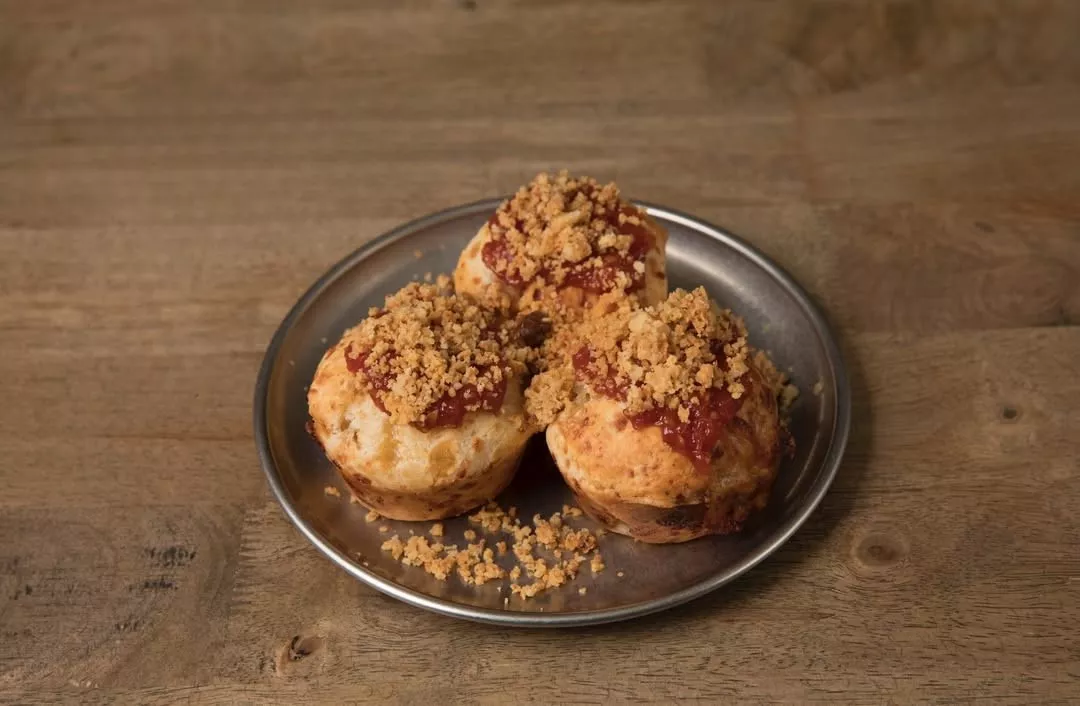 - Chipa Relleno de Cebolla Caramelizada y Provolone, con Mermelada de Tomate Levemente Picante y Crumble de Parmesano).